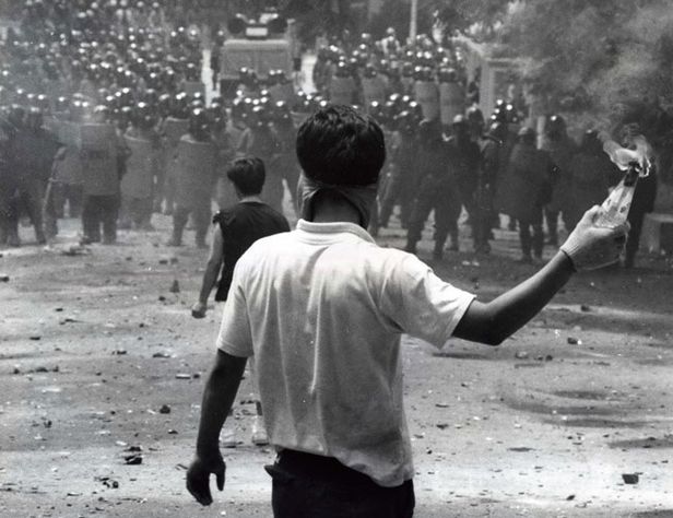 1989.6.30. 전대협주체로 한양대에서 열린 ‘모의평양축전’ 행사장/ 참가한 학생들이 화염병을 던지며 진압경찰에 맞서고 있다.