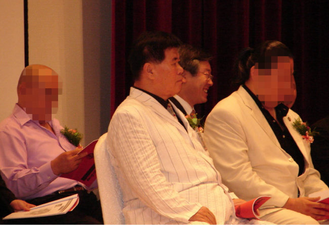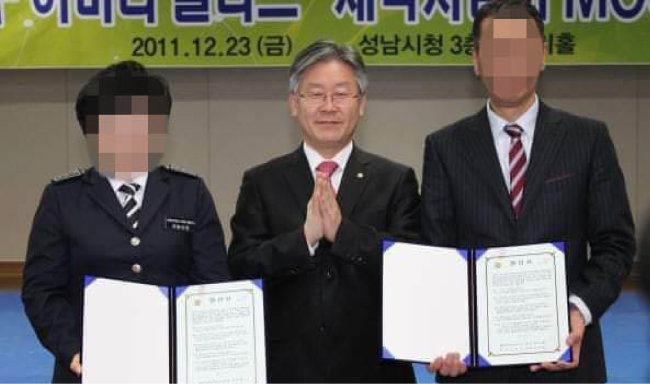 이재명 후보도 2006년 이씨의 행사에 참석했다가 조씨의 주변에서 사진이 찍히기도 했다. 이 후보의 뒤에는 김두한의 종로패에서 조직폭력배 생활을 하다가 배우가 된 조모(81) 씨의 모습도 확인된다. 2008년 4월 성남시 경호경비연합회 창설 행사에서 이 후보의 수행비서인 김씨와 은수미 시장의 비서인 해피바이러스 운영자 김씨가 조씨의 양손을 잡고 사진을 찍은 사실도 있다.